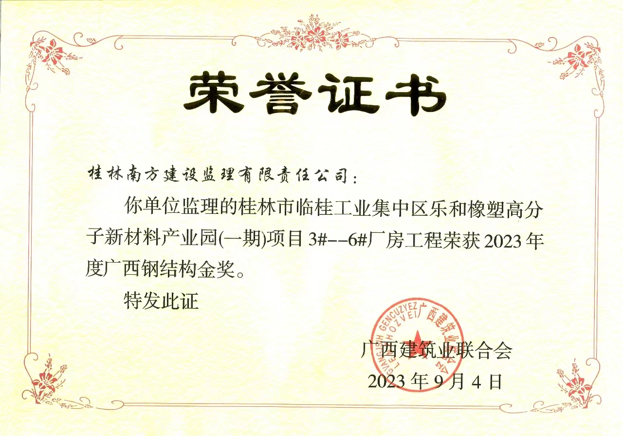 Beat365官网南方监理承担的桂林市临桂工业集中区乐和橡塑高分子新材料产业园(一期)项目3#-6#厂房工程荣获2023年度广西钢结构金奖,也是桂林市获得金奖的3个项目之一。