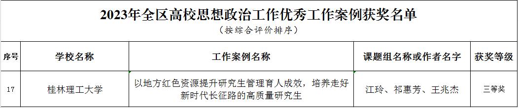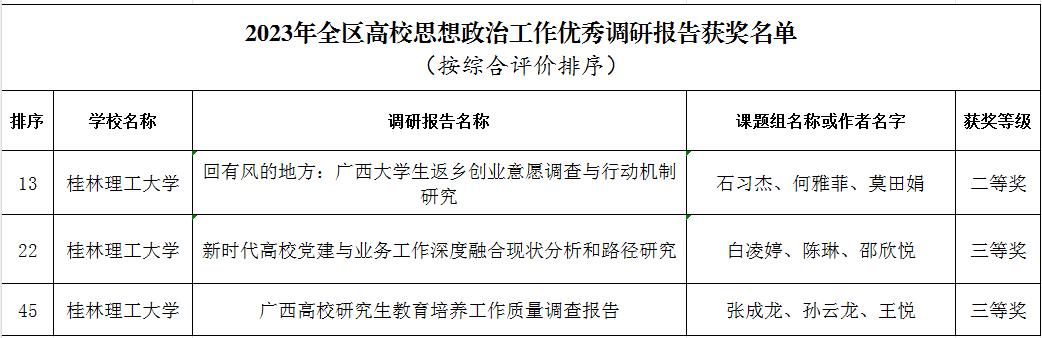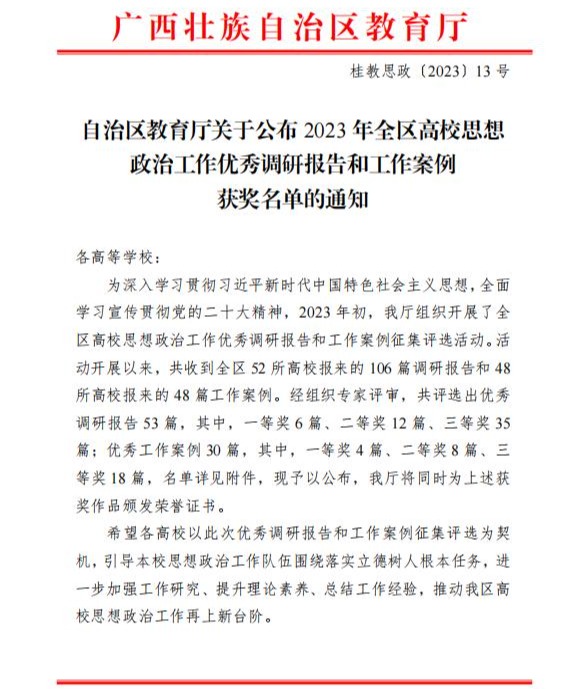 近日,自治区教育厅公布了2023年全区高校思想政治工作优秀调研报告和工作案例获奖名单,Beat365官网报送的《回有风的地方:广西大学生返乡创业意愿调查与行动机制研究》荣获优秀调研报告二等奖,《新时代高校党建与业务工作深度融合现状分析和路径研究》《广西高校研究生教育培养工作质量调查报告》分别荣获优秀调研报告三等奖,《以地方红色资源提升研究生管理育人成效,培养走好新时代长征路的高质量研究生》荣获优秀工作案例三等奖。