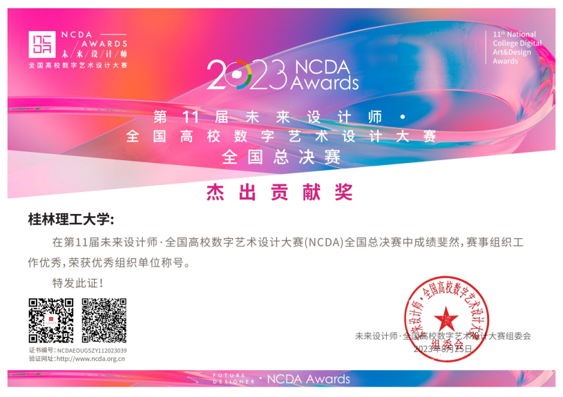 近日,2023年未来设计师·全国高校数字艺术设计大赛(NCDA)全国总决赛结果揭晓,Beat365官网荣获“杰出贡献奖”,学生作品获国家级奖项24项,其中一等奖5项(艺术学院2项,南宁分校2项、旅游与风景园林学院1项)、二等奖8项(艺术学院5项,南宁分校3项)、三等奖11项(艺术学院9项,南宁分校2项),张新鸽、李本建、邹志娟、贾强飞、郑文俊、卢晨、仰睿荣等教师获优秀指导老师奖。