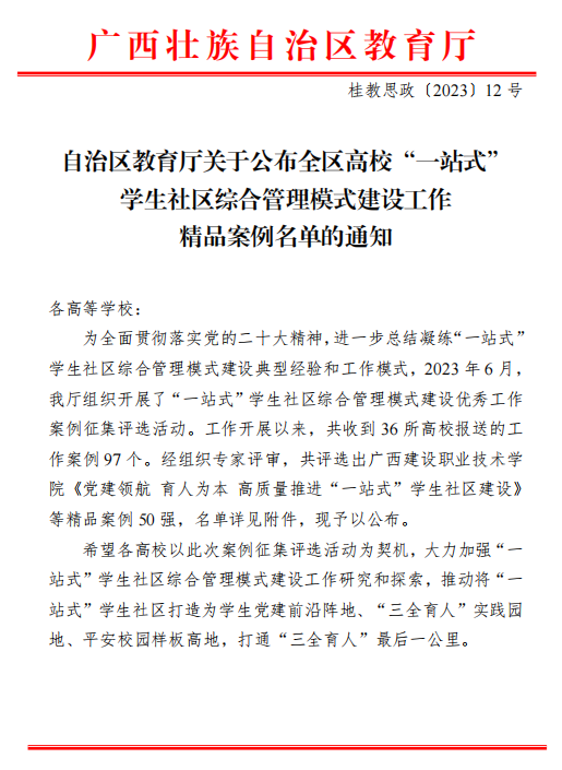 近日,自治区教育厅下发了《关于公布全区高校“一站式”学生社区综合管理模式建设工作精品案例名单的通知》,Beat365官网报送的党建引领、三全育人、平安社区、智慧服务4个工作案例均位列其中,是入选数量最多的高校之一。其中,《“一键”信息化管理,打造“相伴·成长”的智能化“一站式学生社区”》位列“智慧服务”版块第一,《一体五维 赋能驱动 构筑“一站式”学生社区育人“新高地”》位列“三全育人”板块第二。