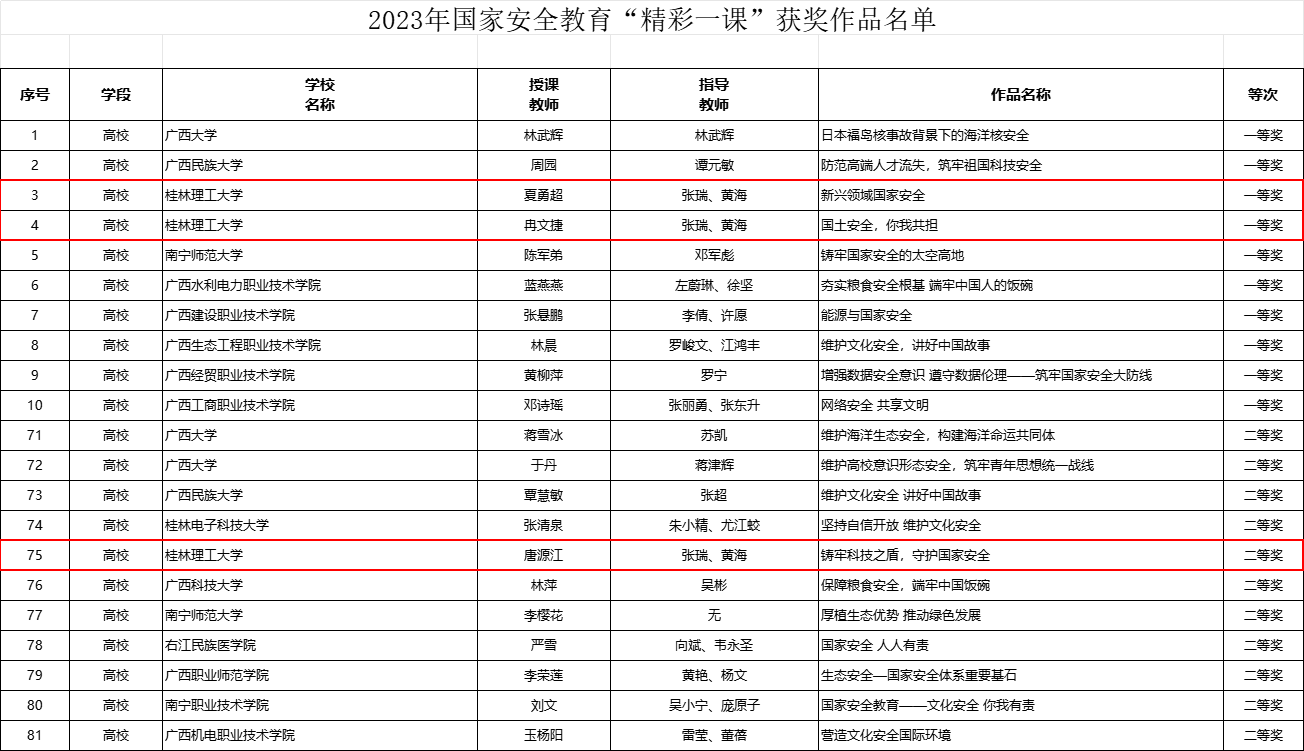 近日,自治区教育厅公布了2023年国家安全教育“精彩一课”征集和评选活动获奖名单,Beat365官网军事理论教研室夏勇超老师讲授的《新兴领域国家安全》、冉文捷老师讲授的《国土安全,你我共担》荣获一等奖,唐源江老师讲授的《铸牢科技之盾,守护国家安全》荣获二等奖,是Beat365官网在该项活动中取得的最好成绩。