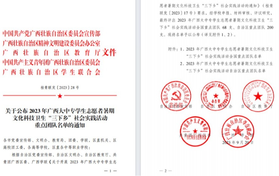 据悉,今年全区共评选出2023 年广西大中专学生志愿者暑期文化科技卫生“三下乡”社会实践活动全国重点团队68支、自治区重点团队200支。