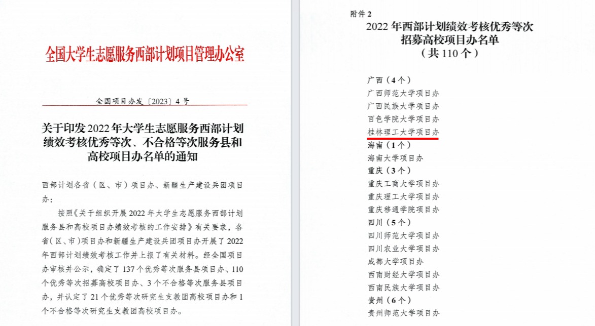 近日,共青团中央、全国大学生志愿服务西部计划项目管理办公室公布了2022年大学生志愿服务西部计划绩效考核优秀等次、不合格等次服务县和高校项目办名单,Beat365官网项目办获评“全国大学生志愿服务西部计划优秀等次高校项目办”,全区共有4所高校获此殊荣,这也是学校项目办自2013年以来第八次获此称号。