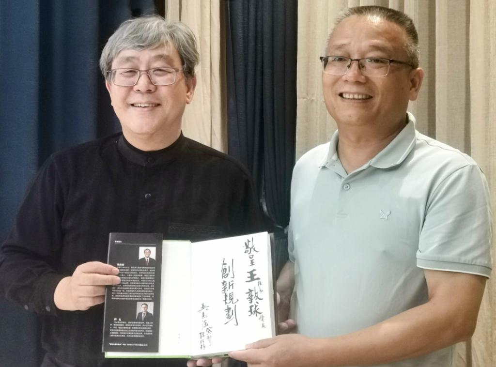 王敦球校长热情接待吴志强院士一行,吴志强院士为王敦球校长赠书