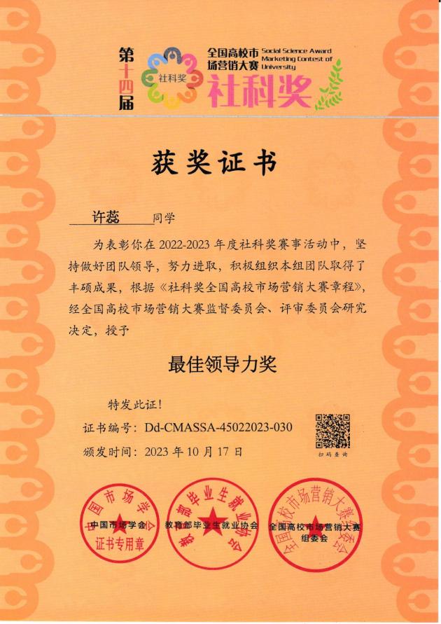 近日,社科奖第十四届全国高校市场营销大赛落下帷幕。南宁分校市场营销专业“真的会谢”团队获得大赛全国总决赛专科组一等奖,指导老师陶中一获“优秀指导教师奖”,参赛团队队长许蕊获“最佳领导力奖”,南宁分校获“优秀组织奖”。