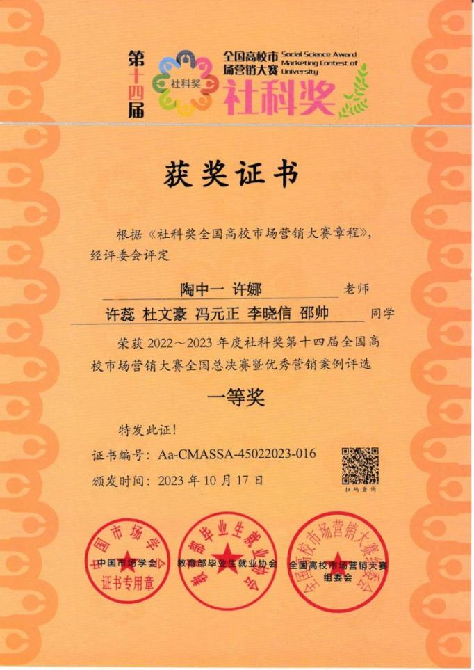 南宁分校学子在社科奖第十四届全国高校市场营销大赛全国总决赛中荣获一等奖