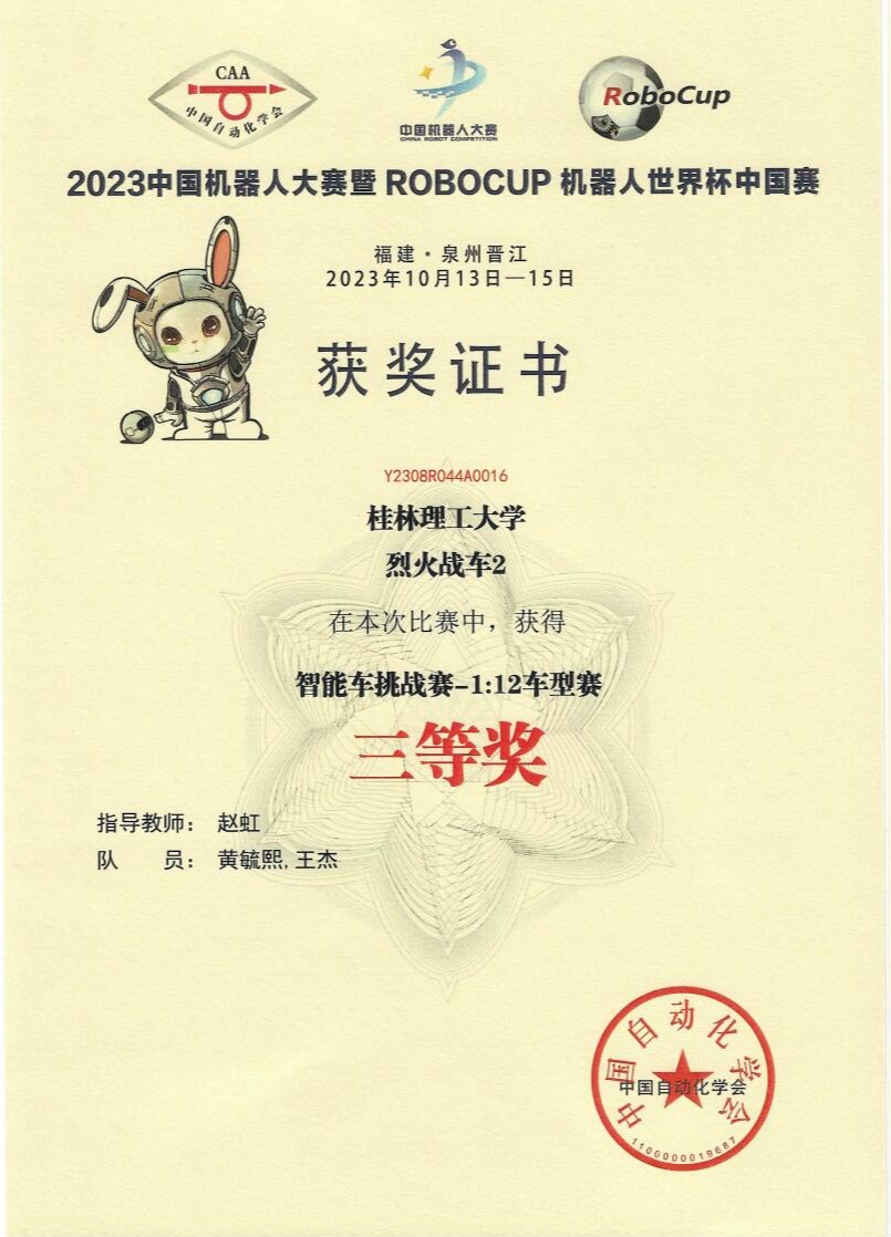 在智能车挑战赛-1:12车型赛中获得全国三等奖