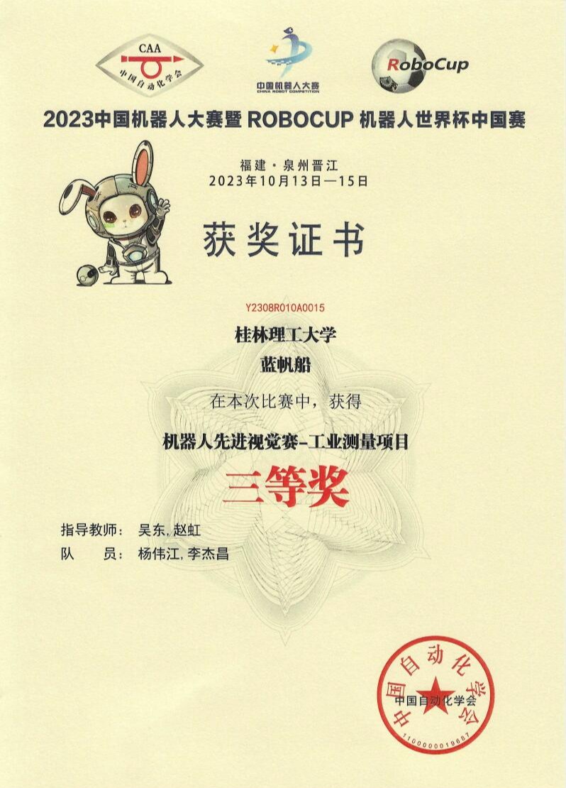 在机器人先进视觉赛-工业测量项目中获得全国三等奖