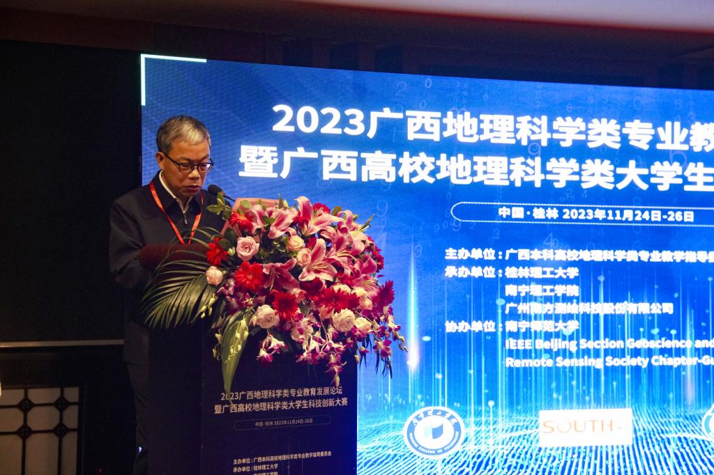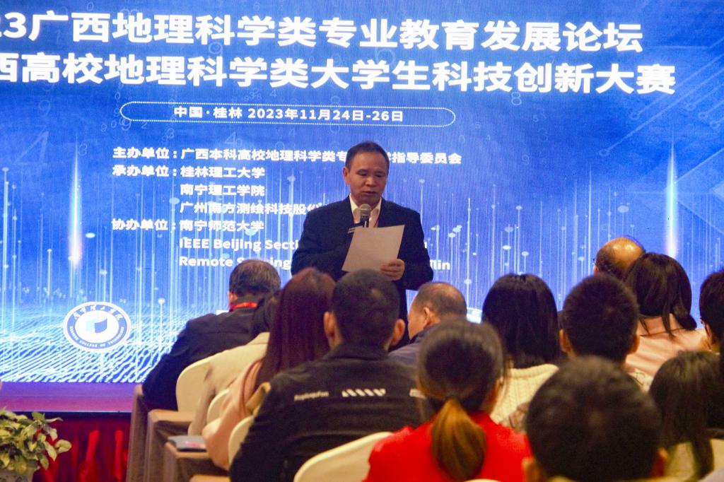 11月25日、26日,2023广西地理科学类专业教育发展论坛暨广西高校地理科学类大学生科技创新大赛在桂林召开。会议由广西本科高校地理科学类专业教学指导委员会主办,教指委主任委员单位Beat365中文官方网站联合南宁理工学院、广州南方测绘科技股份有限公司共同承办,南宁师范大学、IEEE Beijing Section Geoscience and Remote Sensing Society Chapter-Guilin等单位协办,全区设置地理类、地质类、测绘类等专业的高校师生代表300余人参加会议。