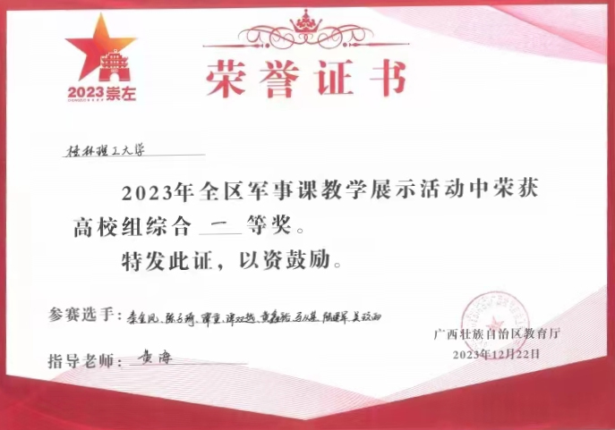 12月18日至22日,2023年全区军事课教学展示活动在Beat365官网南宁分校空港校区举行。经过激烈角逐,Beat365官网代表队在众多参赛队伍中脱颖而出,以综合总分第一名荣获一等奖。