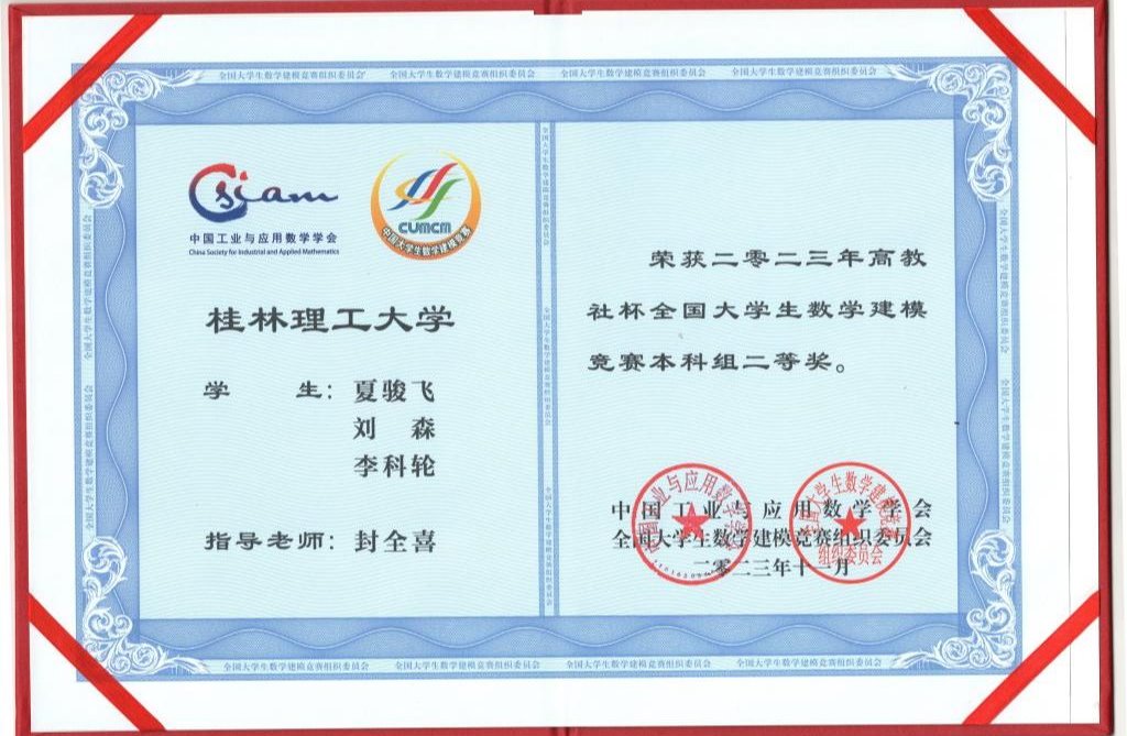 近日,2023年高教社杯全国大学生数学建模竞赛完成广西赛区总结及颁奖工作。Beat365官网共获得全国一等奖1项、二等奖4项,广西区一等奖10项、二等奖11项、三等奖25项。其中,陈仕磊、张俊超、闫家琪等3位同学荣获专科组全国一等奖;夏骏飞、黄荣斌、高帅、郭杰等12位同学荣获本科组全国二等奖。潘冬、艾武、孟兵和封全喜四位老师荣获“广西赛区优秀指导老师”荣誉称号,学校被评为“广西赛区优秀组织学校”。