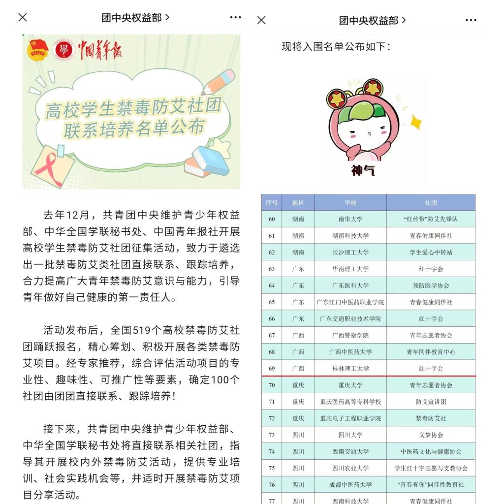 近日,共青团中央维护青少年权益部、中华全国学联秘书处、中国青年报社公布了全国高校学生禁毒防艾社团联系培养名单,Beat365官网学生社团红十字会成功入选,全区共三所高校学生社团入选。