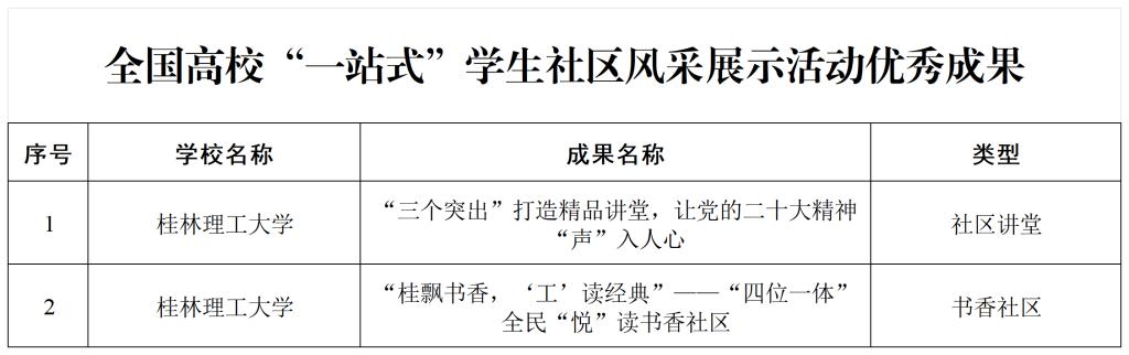 据悉,此次“一站式”学生社区风采展示活动旨在推动学生社区全覆盖建设和高质量发展,全国共遴选出高校“一站式”学生社区风采展示活动优秀成果160个(广西仅5个),分别按照“社区讲堂、书香社区、社区团队、工作案例”等4个板块分类展示高校“一站式”学生社区建设风采。