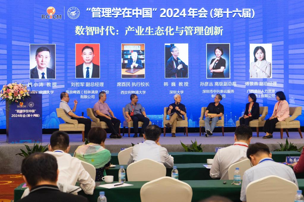 大会共设“实践探索”与“理论研究”两个栏目。在“实践探索”栏目,深圳市中兴新云服务有限公司高级副总裁孙彦丛、广西道尔人力资源(集团)有限公司副总经理傅景燕、燕京啤酒(桂林漓泉)股份有限公司副总经理刘哲君分别以《数智化时代的企业经营管理》《灵活用工数智化转型创新与实践》《数智驱动管理 打造最佳啤酒企业》为题作报告,分享管理实践者的智慧与感悟。随后,上述三位管理实践者,以及席酉民教授、深圳大学管理学院韩巍教授、西安交通大学管理学院姚小涛教授共同举行“业界学界圆桌会议”,深入探讨“数智时代:产业生态化与管理创新”。