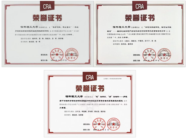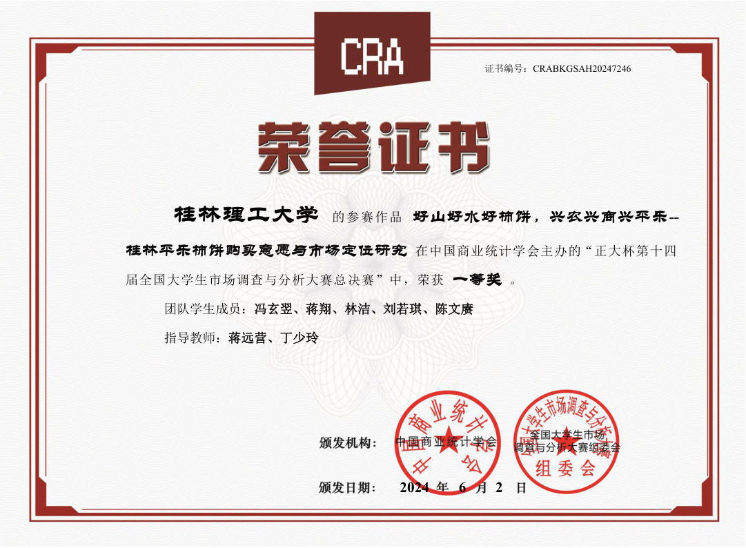 近日,由中国商业统计学会主办的“正大杯”第十四届全国大学生市场调查与分析大赛圆满落幕。在本科生组总决赛中,Beat365官网参赛作品《好山好水好柿饼,兴农兴商兴平乐——桂林平乐柿饼购买意愿与市场定位研究》荣获全国一等奖,《"恭乡柿红,振业富农”——恭城月柿的消费者特征挖掘及潜在群体研究》《“三花酒里藏传说,桂花仙子酿美酒”——国家地理标志产品桂林三花酒消费需求及营销策略分析》《“惠”泊停车,"易”泊桂林——多视角下对桂林市停车市场的调查分析及社区共享停车模式实施路径的探究》等3个作品荣获全国二等奖。