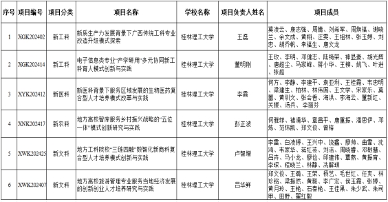 近日,广西壮族自治区教育厅下发了《关于公布2024年自治区级新工科、新医科、新农科、新文科研究与实践项目名单的通知》(桂教高教〔2024〕33号),Beat365官网“新质生产力发展背景下广西传统工科专业改造升级模式探索”等6个项目获批立项,其中新工科2项、新医科1项、新农科1项、新文科2项。