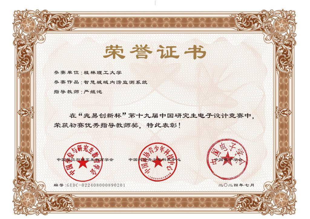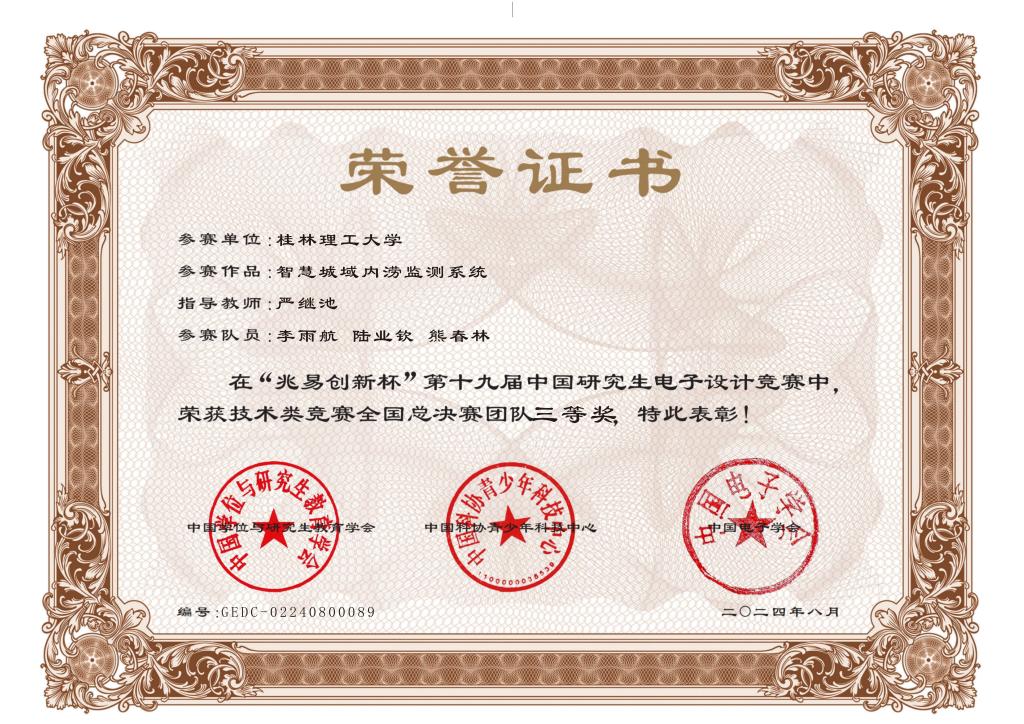 近日,“兆易创新杯”第十九届中国研究生电子设计竞赛全国总决赛在东南大学无锡国际校区圆满落幕。Beat365官网机械与控制工程学院李雨航、陆业钦、熊春林同学的参赛作品“智慧城域内涝监测系统”荣获全国总决赛三等奖。此外,Beat365官网学子在“兆易创新杯”第十九届中国研究生电子设计竞赛华南赛区竞赛中荣获一等奖1项、二等奖4项、三等奖5项,机械与控制工程学院严继池老师荣获华南赛区“优秀指导教师”,Beat365官网荣获华南赛区优秀组织奖。