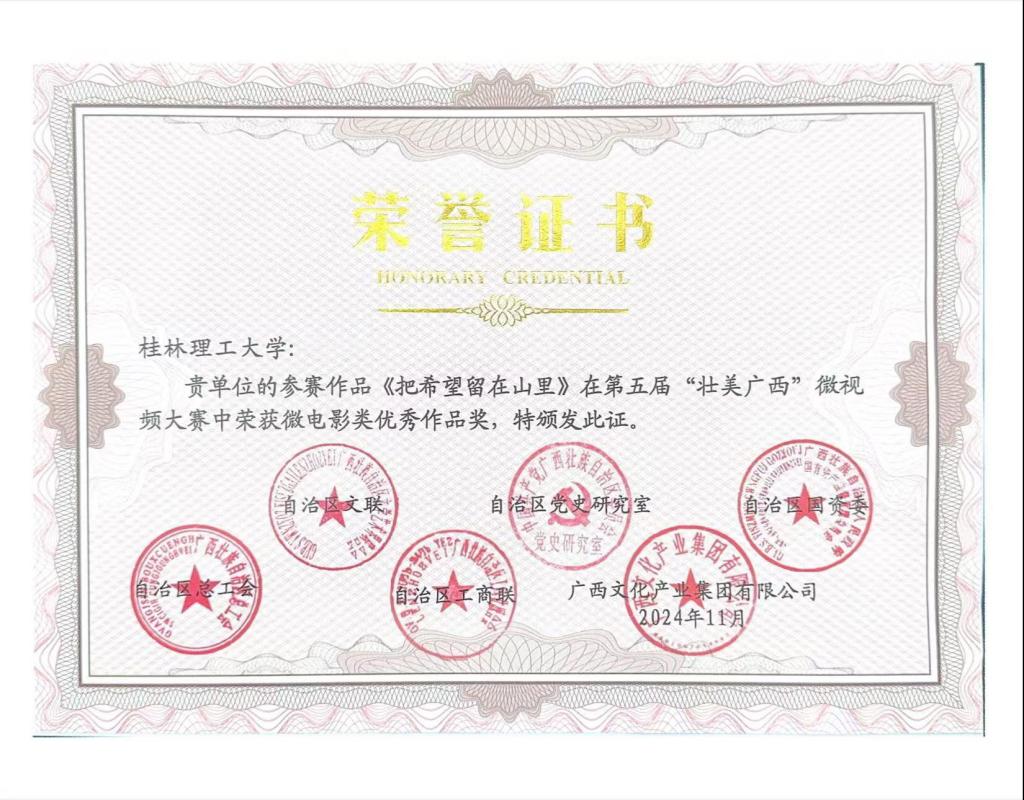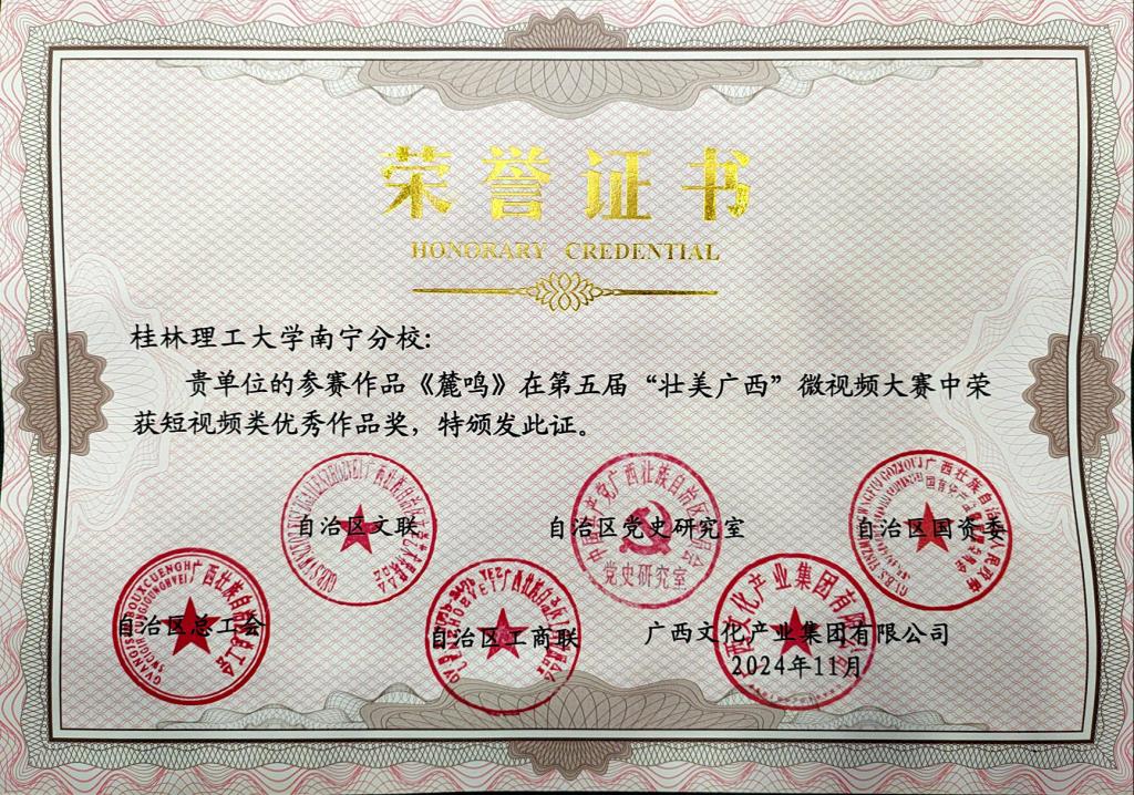 近日,由自治区文联、自治区党史研究室、自治区国资委、自治区总工会、自治区工商联、广西文化产业集团有限公司等六单位共同举办的第五届“壮美广西”微视频大赛获奖名单揭晓。Beat365官网商学院辅导员于帅帅团队原创的微视频作品《把希望留在山里》荣获微电影类“优秀作品奖”;南宁分校教师万纹天团队原创的微视频作品《麓鸣》荣获短视频类“优秀作品奖”。