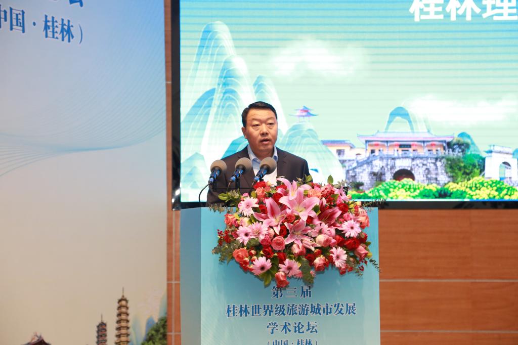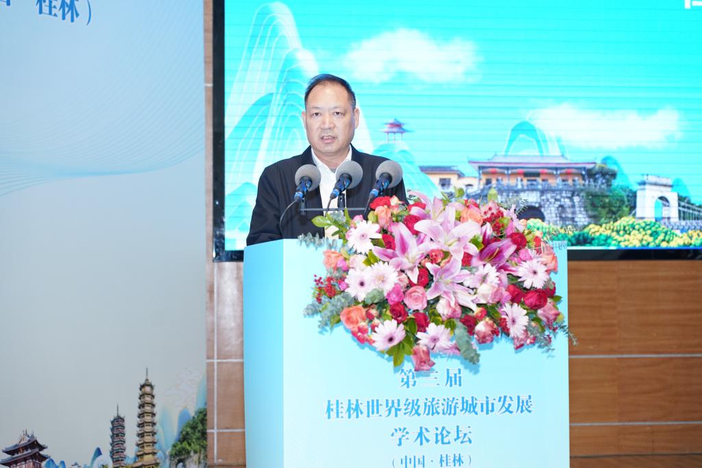 谭建国在致辞中希望广大专家学者、高校老师、社科工作者能以此次论坛为契机,自觉担负起建设世界级旅游城市的责任和使命,用桂林丰富的山水资源和厚重的历史文化,赋能桂林经济高质量发展。