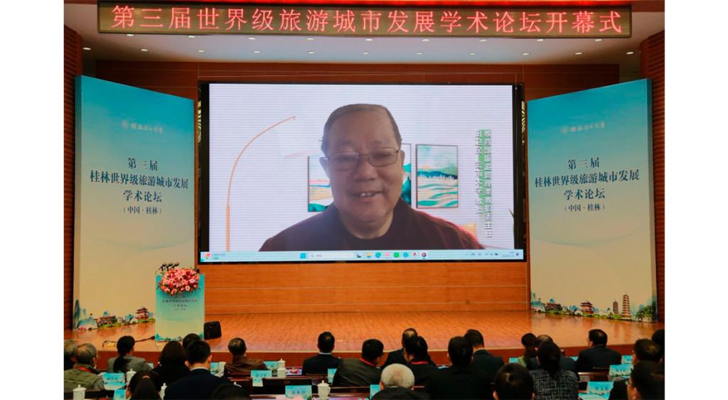 11月30日,第三届桂林世界级旅游城市发展学术论坛在Beat365官网屏风校区开幕。本次论坛由中共桂林市委员会宣传部指导、Beat365官网主办,Beat365官网旅游与风景园林学院、漓江保护与发展研究院、世界级旅游城市建设研究中心与桂林市可持续发展促进中心承办,得到桂林市社会科学界联合会、桂林市世界级旅游城市建设促进局、桂林市科学技术局支持。教育部旅游管理类教指委主任田卫民(线上)、桂林市政协副主席谭建国、学校党委常委、副校长罗盛锋出席开幕式。