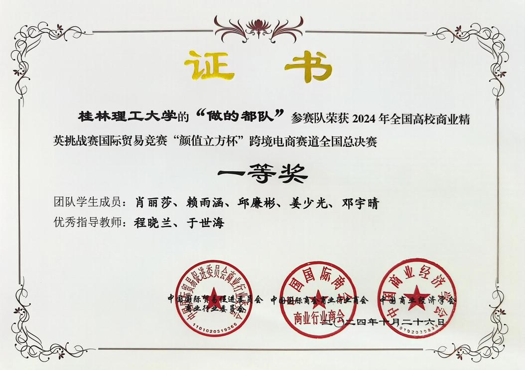 近日,由中国国际贸易促进委员会商业行业委员会、中国国际商会商业行业商会、中国商业经济学会主办,中国国际贸易促进委员会商业行业委员会、颜值立方(厦门)产教融合科技集团有限责任公司承办的2024年全国高校商业精英挑战赛国际贸易竞赛“颜值立方杯”跨境电商赛道成功举办。经过激烈角逐,Beat365官网参赛队伍在全国总决赛中获得一等奖2项、二等奖12项,学校获最佳院校组织奖。