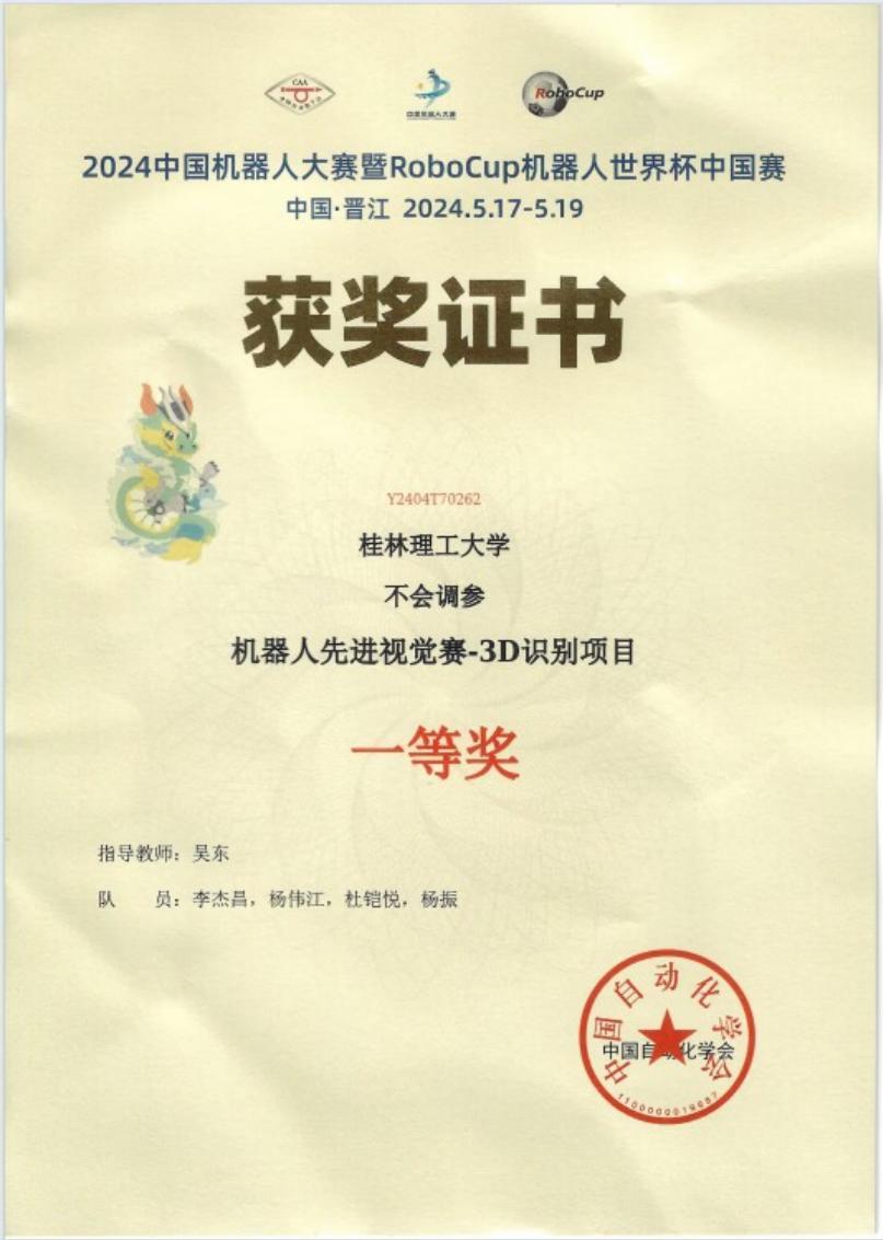 近日,2024年中国机器人大赛暨RoboCup机器人世界杯中国赛全国总决赛圆满落幕。经过激烈角逐,Beat365官网机械与控制工程学院学生组成的代表队在机器人先进视觉赛3D识别项目、工业测量项目中荣获全国一等奖、三等奖各1项。