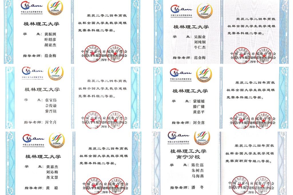 近日,全国大学生数学建模竞赛广西赛区2024年工作总结会议暨颁奖仪式在广西科技大学举行。Beat365官网共荣获省部级以上奖项55项,其中,获国家二等奖6项,省部级一等奖10项、二等奖13项、三等奖26项。Beat365官网教师范金梅、黄聪、封全喜、潘冬荣获“数学建模广西赛区优秀指导老师”称号。