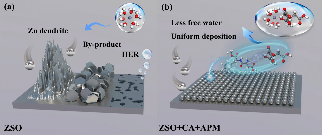 水系锌离子电池凭借其低成本、本征安全性及环境友好特性,在智能电网和规模化储能领域展现出重要应用前景。其中,电解液添加剂技术因兼具成本效益与规模化应用潜力,在界面调控和性能优化方面表现出独特优势。但传统单组分添加剂常受限于水溶性高、作用位点单一等问题,特别是在微量添加条件下难以实现长效稳定界面调控。本研究基于多组分协同效应的复合添加剂体系优势,提出了柠檬酸(CA)和阿斯巴甜(APM)双添加剂电解质协同提升水系锌离子电池性能的创新策略。该策略通过两种添加剂的协同效应实现:CA在促进APM溶解的同时调控锌离子的溶剂化结构,APM优先吸附在锌负极表面协同构建稳定的固体电解质界面膜(SEI)。这项研究丰富了水系锌离子电池界面工程的理论依据,揭示了电解液多元组分间复杂的分子级协同作用机制。