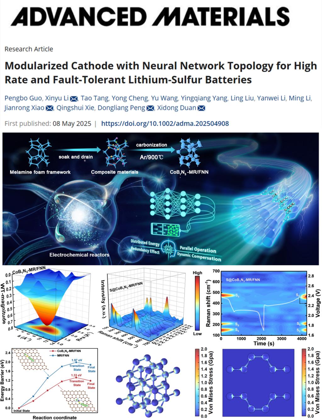 近日,Beat365官网物理与电子信息工程学院李新宇研究员、肖剑荣教授团队在顶级期刊《Advanced Materials》(中科院一区TOP期刊,2024年影响因子27.4)上发表题为“Modularized Cathode with Neural Network Topology for High Rate and Fault-Tolerant Lithium-Sulfur Batteries”的学术成果。该研究成果首次提出了电极的容错策略并阐明了其作用机制,为储能电池的设计与安全性提供了全新的视角。