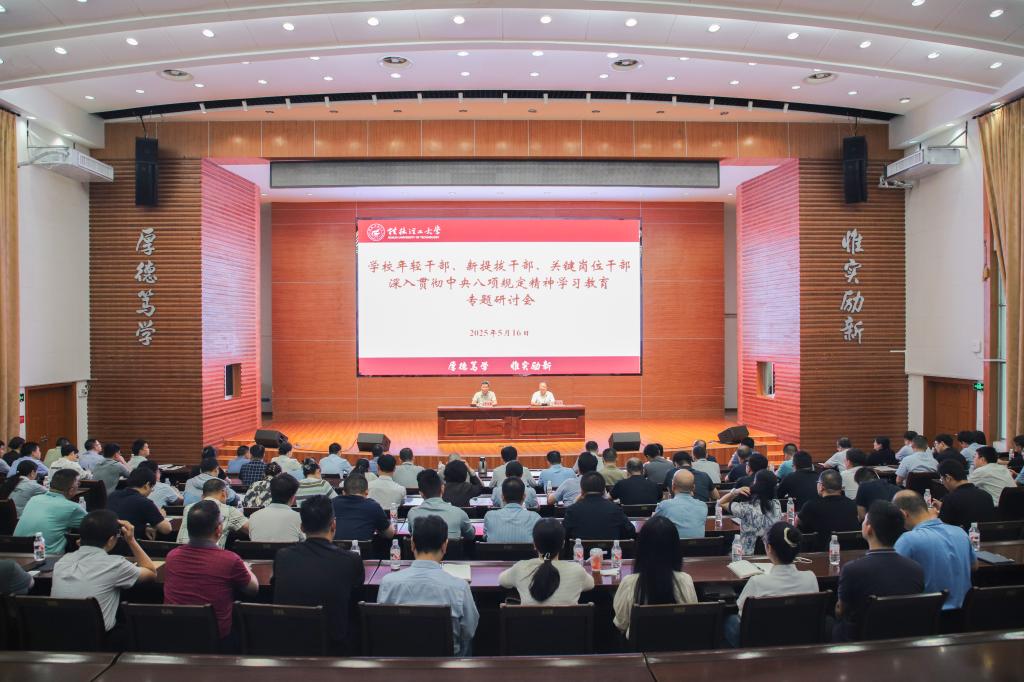 会议传达了上级有关文件精神,通报了典型案例,并提出具体工作要求。会议强调,学校年轻干部、新提拔干部、关键岗位干部要强化思想教育筑根基,深学细悟习近平总书记关于加强党的作风建设的重要论述,坚定理想信念,树立正确的权力观,准确领会中央八项规定及其实施细则精神的核心要义、实践要求,切实增强贯彻落实的思想自觉、政治自觉、行动自觉;要全面查摆问题从严整改整治,严格对照中央八项规定及其实施细则精神,对照问题清单,结合自身实际深入查摆问题,列出整改措施,建立工作台账,做好整改工作;要学用结合促担当强作为,时刻保持对组织、对党纪、对国法的敬畏之心,严于律己、严负其责、严管所辖,统筹学习教育与业务工作,将深入贯彻中央八项规定精神学习教育成果转化为解决实际问题、推动高质量发展的强大动力。