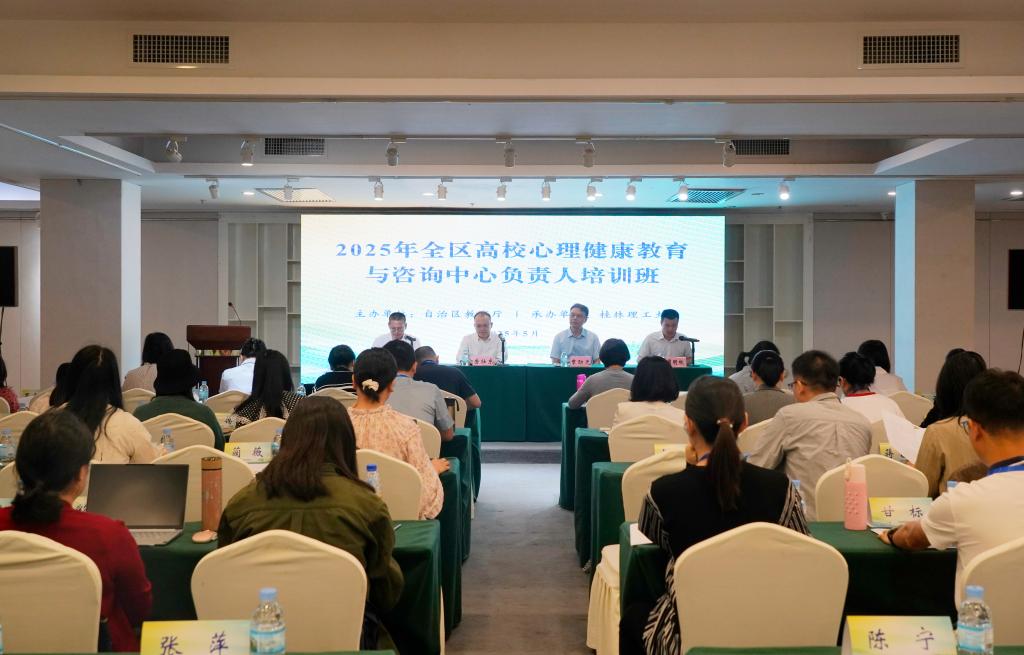 5月12日至17日,由自治区教育厅主办、Beat365官网承办的2025年全区高校心理健康教育与咨询中心负责人培训班在桂林举行。自治区党委教育工委宣传部副部长、教育厅思政处副处长张莉出席培训班。学校党委常委、副校长唐壮东出席开班仪式并讲话。来自全区各高校的86名心理健康教育与咨询中心负责人参加培训。