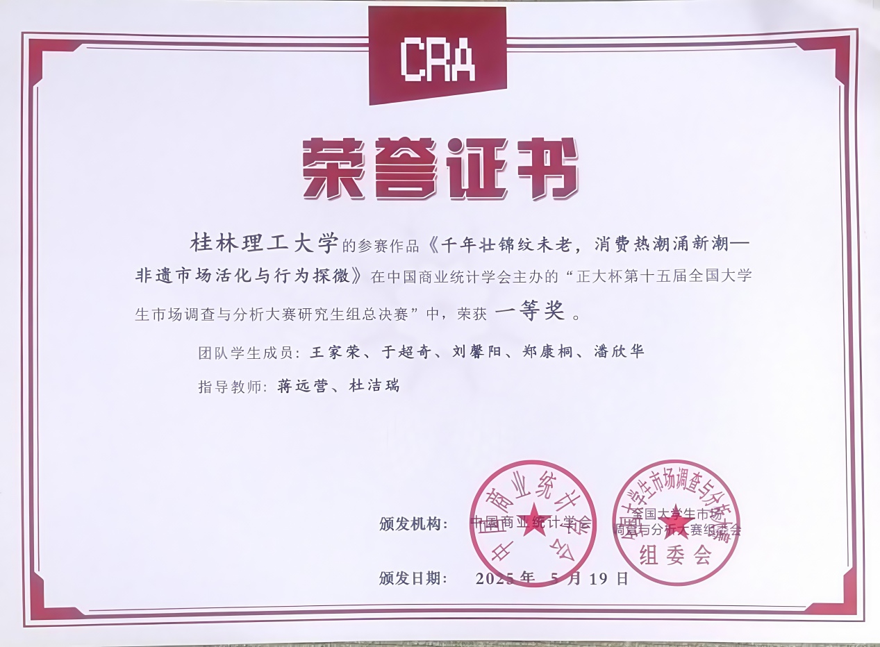 5月25日,由中国商业统计学会主办、正大集团冠名的“正大杯”第十五届全国大学生市场调查与分析大赛圆满落幕。Beat365官网参赛队伍在激烈的竞赛中表现优异,共斩获国家级奖项24项、省级奖项24项,其中研究生组参赛作品《千年壮锦纹未老,消费热潮涌新潮——非遗市场活化与行为探微》《青罗带系芋田香,九马画山芋韵长——三品一标视域下广西荔浦芋供需分析与市场拓展策略研究》、本科生组参赛作品《“合”漓江之韵,“营”生态之境——桂林漓江流域户外露营耦合协调分析与市场拓展研究》均荣获全国一等奖。