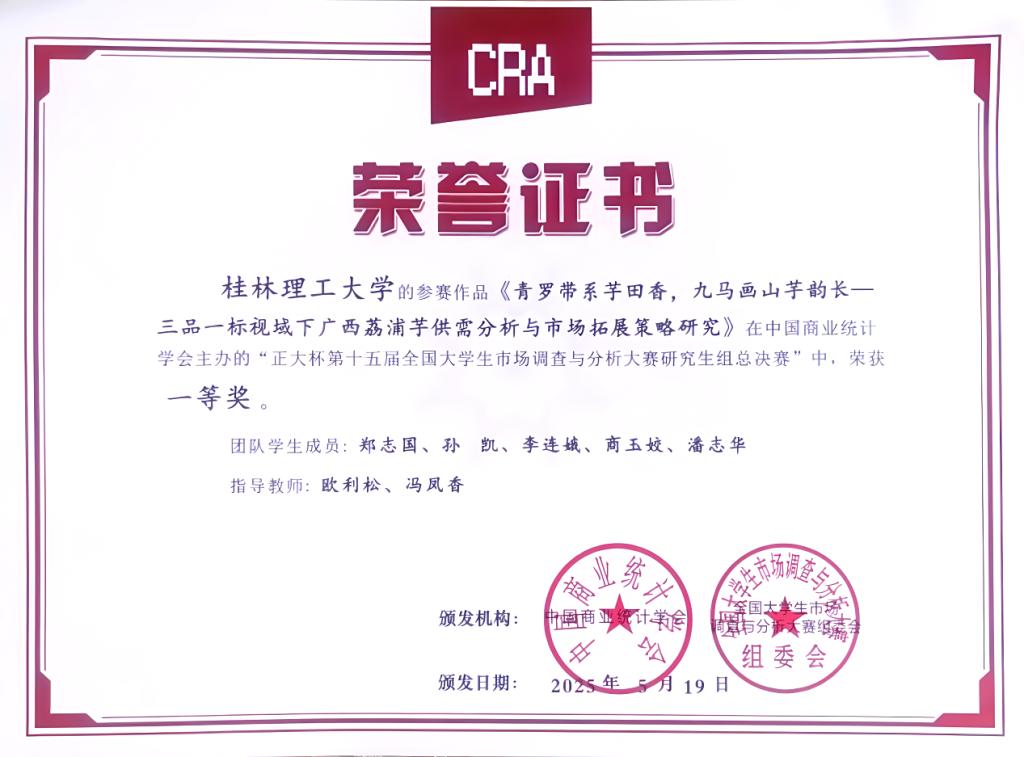 研究生组参赛作品《青罗带系芋田香,九马画山芋韵长——三品一标视域下广西荔浦芋供需分析与市场拓展策略研究》斩获研究生组全国一等奖
