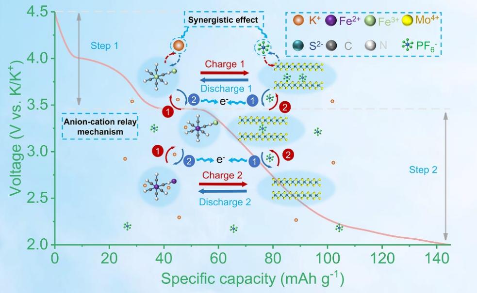 鉴于此,研究团队提出了一种基于普鲁士蓝类似物的杂化正极,其创新性地采用阴-阳离子接力工作机制。通过将MoS2/碳纤维(CFs)同时作为导电添加剂和阴离子宿主,该设计显著提升了电化学性能:在保持143.8mAhg-1高容量的同时,500次循环后容量保持率高达87.4%(单周衰减率仅0.025%),是目前报道的性能最优异的PBAs基PIBs正极之一。当与MoS2/CFs负极构建双离子PIBs时,全电池在100 mA g-1电流密度下实现90.7mAhg-1的比容量,平均库伦效率达96.7%,100次循环后容量保持率更提升至104.4%。这项工作不仅验证了阴-阳离子接力机制是改良传统正极的普适性策略,更为设计高性能PIBs开辟了新路径。