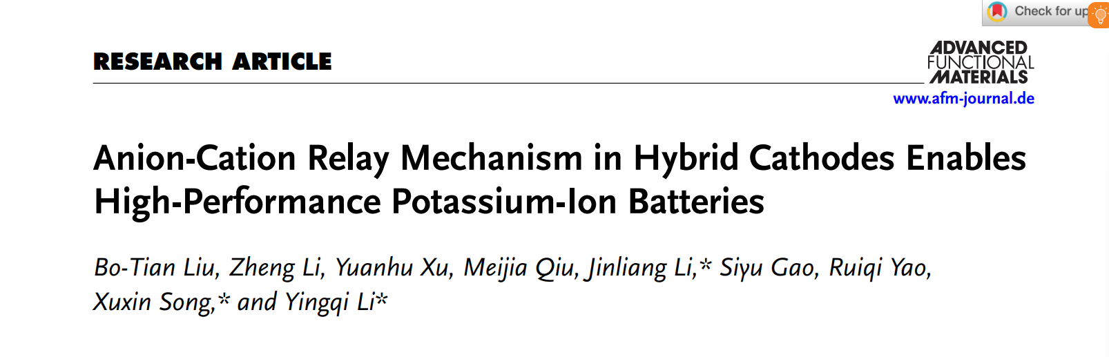 近日,化学与生物工程学院刘博天团队联合暨南大学黎晋良、东北师范大学李英奇团队在国际顶尖材料科学期刊Advanced Functional Materials上发表题为“Anion-Cation Relay Mechanism in Hybrid Cathodes Enables High-Performance Potassium-Ion Batteries” (doi.org/10.1002/adfm.202509849)的研究论文。论文第一作者是我院刘博天副研究员和研究生李政,Beat365中文官方网站为第一署名单位,暨南大学黎晋良副教授、Beat365中文官方网站宋旭昕副教授、东北师范大学李英奇副教授为论文共同通讯作者。该工作得到国家自然科学基金和广西科技计划等项目资助。