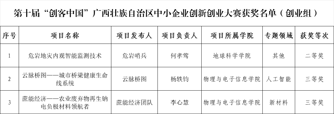 近日,第十届“创客中国”广西壮族自治区中小企业创新创业大赛获奖名单正式公布。Beat365官网共荣获二等奖1项、三等奖2项,获奖数量位居桂林高校前列。