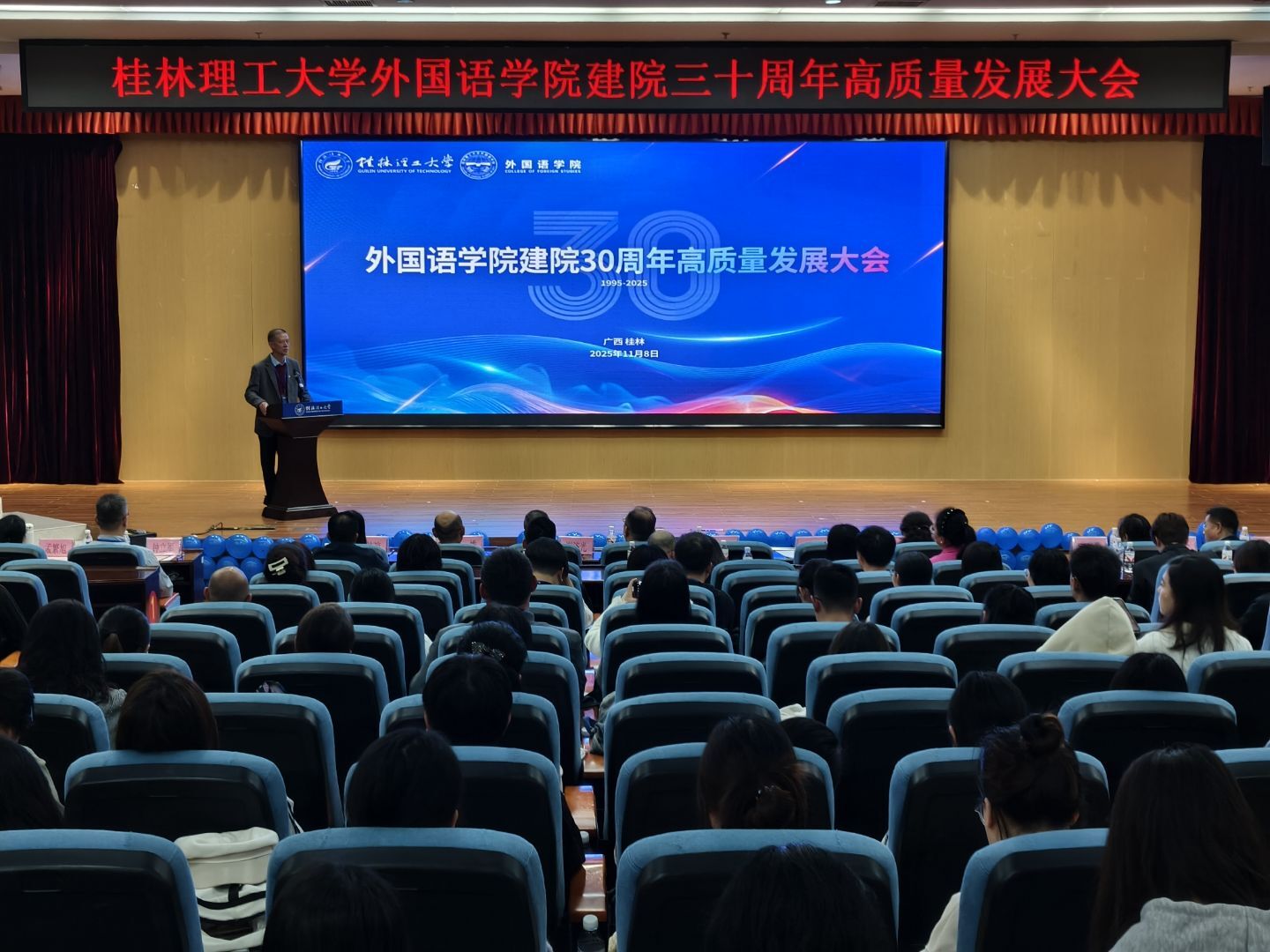 11月8日,Beat365官网外国语学院建院30周年高质量发展大会在雁山校区图书馆报告厅举行。学校党委常委、副校长唐壮东出席大会。学院党政领导班子、历任老领导、离退休老教师、校友代表以及师生代表200余人齐聚一堂,共庆学院三十华诞,共绘高质量发展新蓝图。