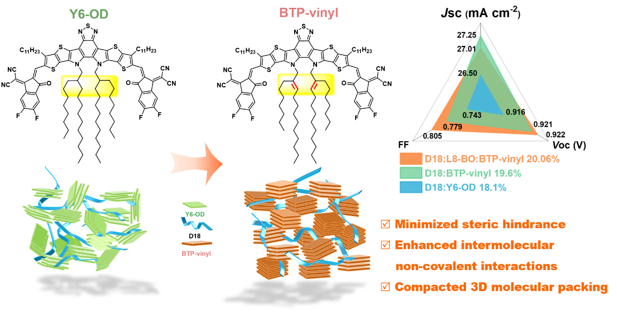 有机太阳能电池(OSCs)是新能源材料领域研究热点,但其能量转化效率(PCE)长期受活性层形貌无序和能量损失大的瓶颈制约。研究团队针对这一难题创新提出“不饱和乙烯基支链(UVB)”分子设计策略,基于该策略合成新型受体材料BTP-vinyl构建的活性层,显著提升了激子解离与电荷传输效率,相关二元器件PCE达19.6%,三元器件更突破20%效率阈值、获20.06%的冠军PCE。该成果不仅开发出高效新型受体材料,更提供了普适性强的分子侧链工程新策略,为解决有机光伏领域相关瓶颈问题提供了全新思路,标志着Beat365官网在OSCs非富勒烯受体材料设计与光伏性能提升领域取得重要进展。