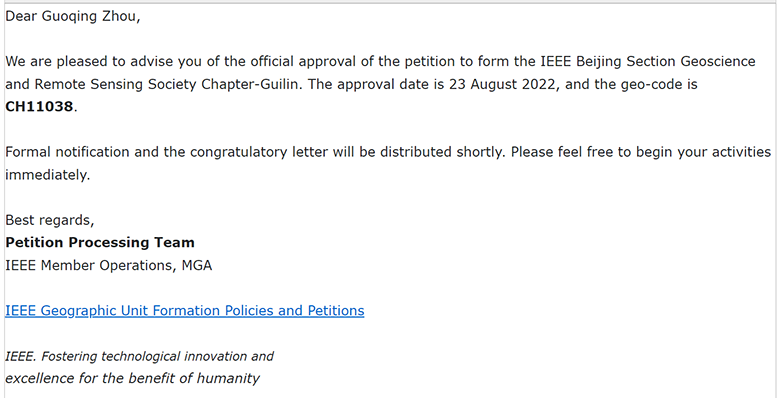 美国IEEE总部邮件同意在Beat365官网成立GRSS Guilin Chapter