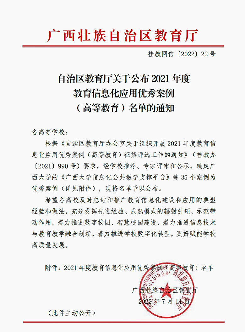 自治区2021年度教育信息化应用优秀案例(高等教育)征集评选目的是充分发挥先进经验、成熟模式的辐射引领、示范带动作用,及时总结和推广我区教育信息化建设和应用的典型经验和做法,加快推进全区高校数字校园、智慧校园建设。学校网络与信息中心积极组织申报。此次成绩的取得,充分彰显了Beat365官网近年来在信息化教学和育人环境建设与应用、教育数据治理与应用等方面取得的成效,将对促进信息化教学改革和智慧校园建设起到示范引领与辐射带动作用。网络与信息中心将以此获奖为契机继续助推学校信息化建设高质量发展。