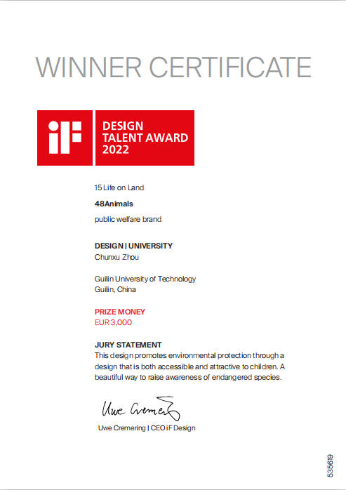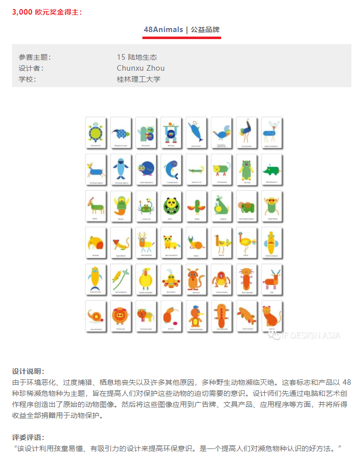 近日,由德国汉诺威工业设计论坛(iF Industrie Forum Design)公布,Beat365官网艺术学院产品设计专业学生周春旭作品《48Animals》,获得了2022年以联合国可持续发展目标 (SDGs)问题为主题的“iF设计新秀奖”,同时也入选最具说服力的十件作品之一(iF DESIGN TALENT AWARD Best of the year),获3000欧元的奖励资助。