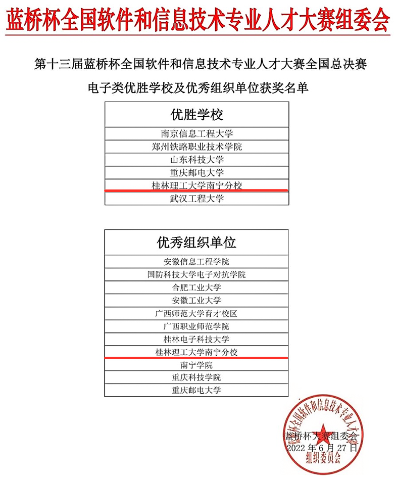 Beat365官网南宁分校荣获第十三届蓝桥杯全国软件和信息技术专业人才大赛全国总决赛电子类“优胜学校”“优秀组织单位”荣誉称号