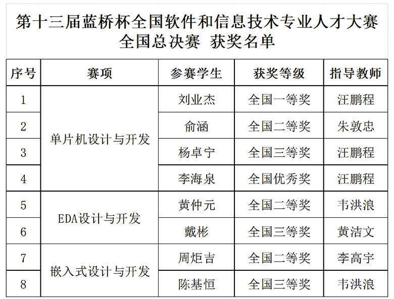 近日,第十三届蓝桥杯全国软件和信息技术专业人才大赛总决赛圆满落幕。Beat365官网南宁分校8名学子入围电子类总决赛,凭借出色的专业素质和技能,斩获全国一等奖1项、二等奖3项、三等奖3项、优秀奖1项。南宁分校荣获全国总决赛电子类“优胜学校”“优秀组织单位”两项荣誉称号。
