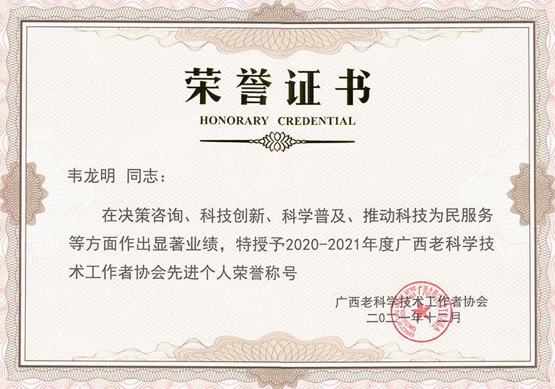 韦龙明教授被授予2020-2021年度广西老科学技术工作者协会先进个人荣誉称号