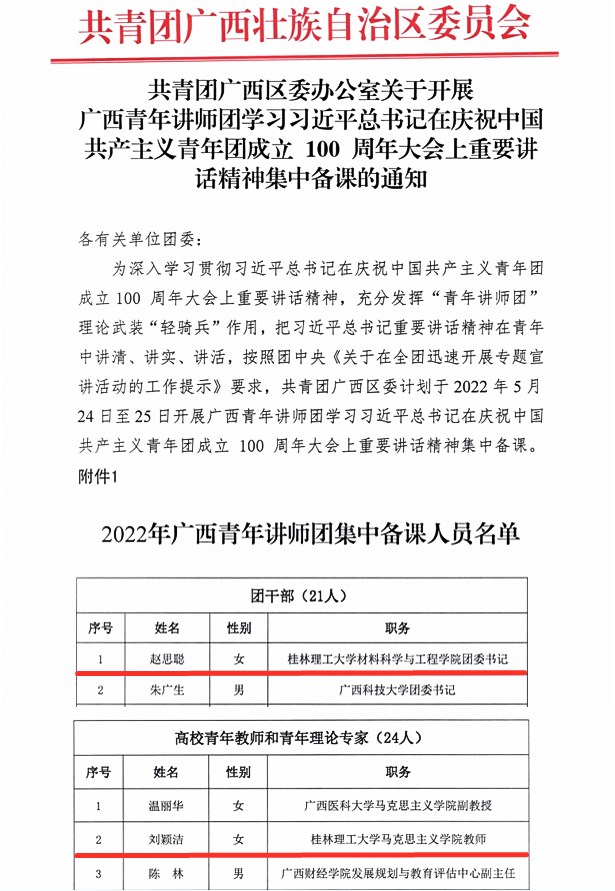 Beat365官网材料科学与工程学院团委书记赵思聪、马克思主义学院教师刘颖洁入选2022年广西青年讲师团集中备课人员名单