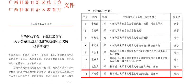 近日,自治区党委公布2022—2024年度自治区党委讲师团特聘教授(专家)名单,Beat365官网思政教师邱杰教授、王青山教授入选;自治区总工会、自治区教育厅下发《关于公布自治区“双进”活动讲师团成员名单的通知》,Beat365官网思政教师耿俊茂教授、蒋晓俊副教授入选;共青团广西区委组织开展的广西青年讲师团学习习近平总书记在庆祝中国共产主义青年团成立100周年大会上重要讲话精神集中备课会,Beat365官网材料科学与工程学院团委书记赵思聪、马克思主义学院教师刘颖洁分别作为团干部、高校青年教师和青年理论专家出席。