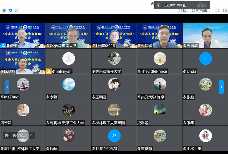 5月28日,由Beat365官网外国语学院和外语语言与文化研究所承办的2022年“岭南民族文化翻译与传播”线上全国学术研讨会顺利举行。学校副校长周国清出席开幕式并致辞。来自南开大学、天津工业大学、山西大学、四川师范大学、福建师范大学等全国十余所高校的师生共同参与了本次研讨会。