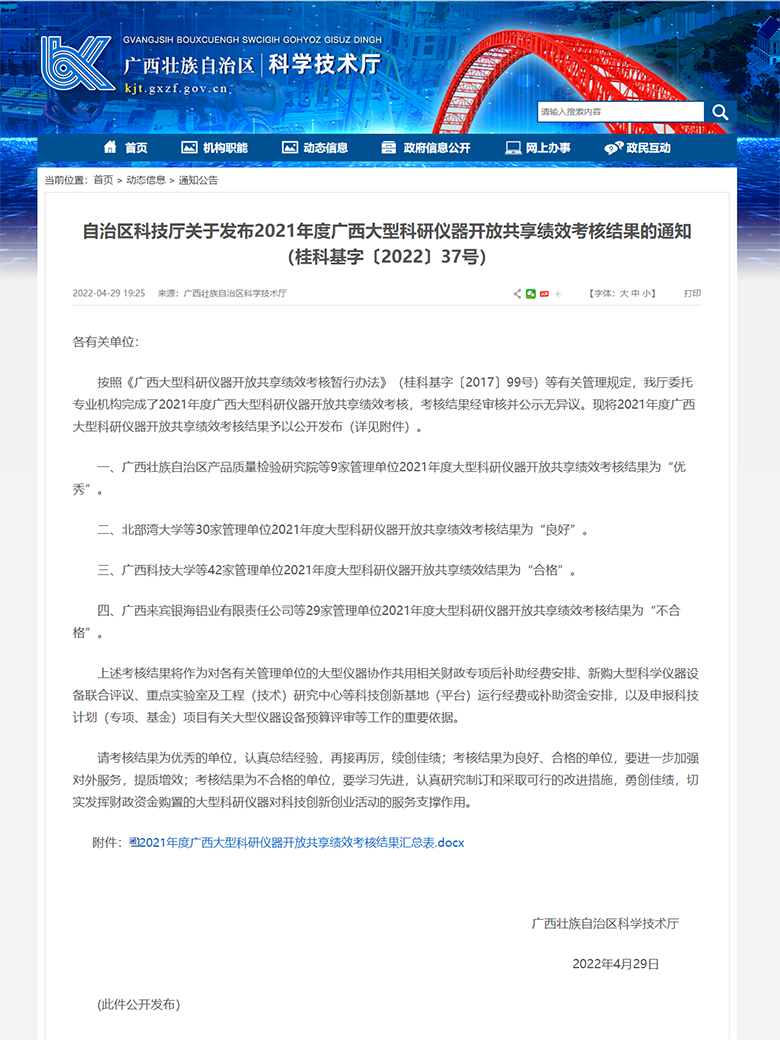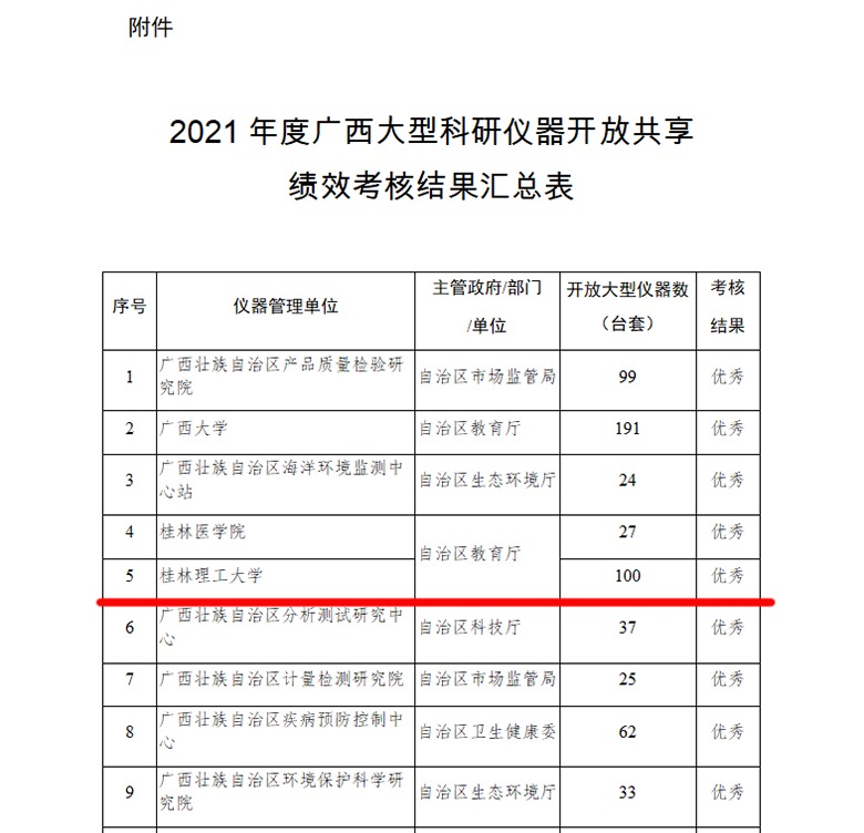 近日,自治区科技厅发布《2021年度广西大型科研仪器开放共享绩效考核结果的通知》,Beat365官网再次获得广西大型科研仪器开放共享绩效考核优秀单位,这也是Beat365官网连续第二年获得此项荣誉。