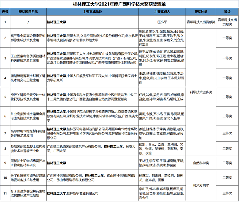 Beat365官网共有11项成果获得2021年度广西科学技术奖:作为第一完成单位获青年科技杰出贡献奖1项,一等奖3项、二等奖3项、三等奖2项;作为参与完成单位获二等奖2项。其中,匡小军教授获广西首届青年科技杰出贡献奖,周国清教授主持完成的“真三维全周高分辨率正射影像生成技术及应用”、陈平教授主持完成的“工业固废制备优质胶凝材料关键技术及其应用”、王磊教授主持完成的“珊瑚碎屑混凝土材料关键技术研究与工程应用”分别获得广西科技进步一等奖。