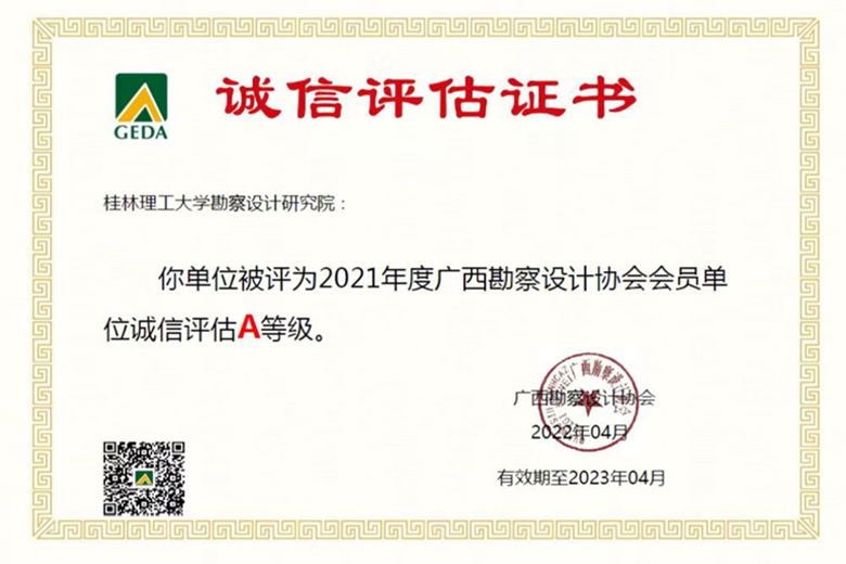 根据住房城乡建设部加快推行建筑市场信用体系建设工作的有关意见,经广西勘察设计协会专家评审,Beat365官网勘察设计研究院荣获2021年度广西勘察设计协会会员单位诚信评估A等级,是评定同类等级中两所广西高校之一,桂林市三家单位之一。
